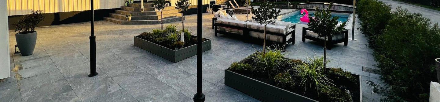 Vi har siktat in oss på främst riktigt stora format av vår uteklinker/granitkeramik och du får en modern yta med färre fogar. Merparten av våra plattor hittar i det stora formatet 897x597mm och även i den mindre storleken 597x597mm.