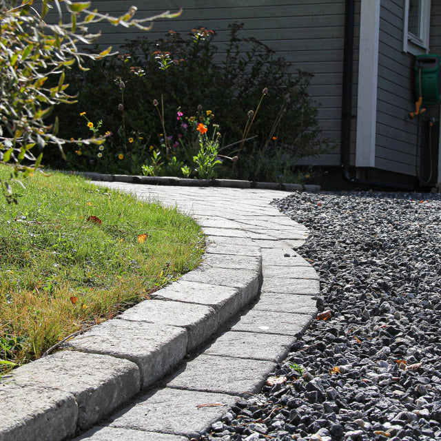 Nyansen är väldigt enkel på denna sten. Den grå betongen ger en ljus ram och kontrast kan lätt skapas vid inramning av en grafitfärgad yta. För mer effekt rekommenderar vi att du väljer en marksten i färgen gråmix eller att blanda upp din grå marksten med stänk av grafit för en skön kontrast. Kantstenen får sedan agera bård och sätta en ram på trädgårdens tavla.