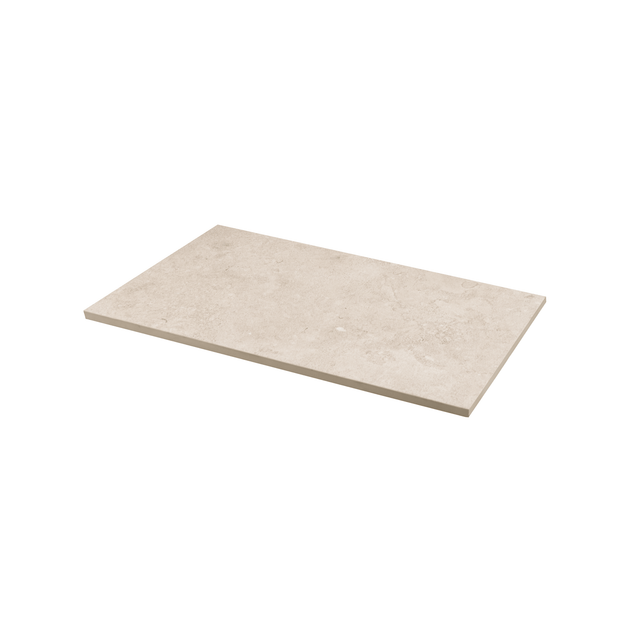 Plattornas varmt beige ton skiftar i nyans och textur, vilket gör varje 60×30-platta unik och hemtrevlig.