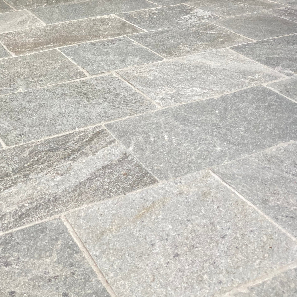 Våra glimmerskiffer hällar säljs med en färdig bredd på 300mm och där längderna varierar. Detta gör att du får en något mer levande yta än traditionella kvadratiska plattor. Ytan kommer i något vi kallar natur. Det är en kluven sten och ytan blir därför strukturerad och väldigt naturlig. Du får ett skönt grepp under foten och en vacker struktur när solens strålar letar sig fram över ytan