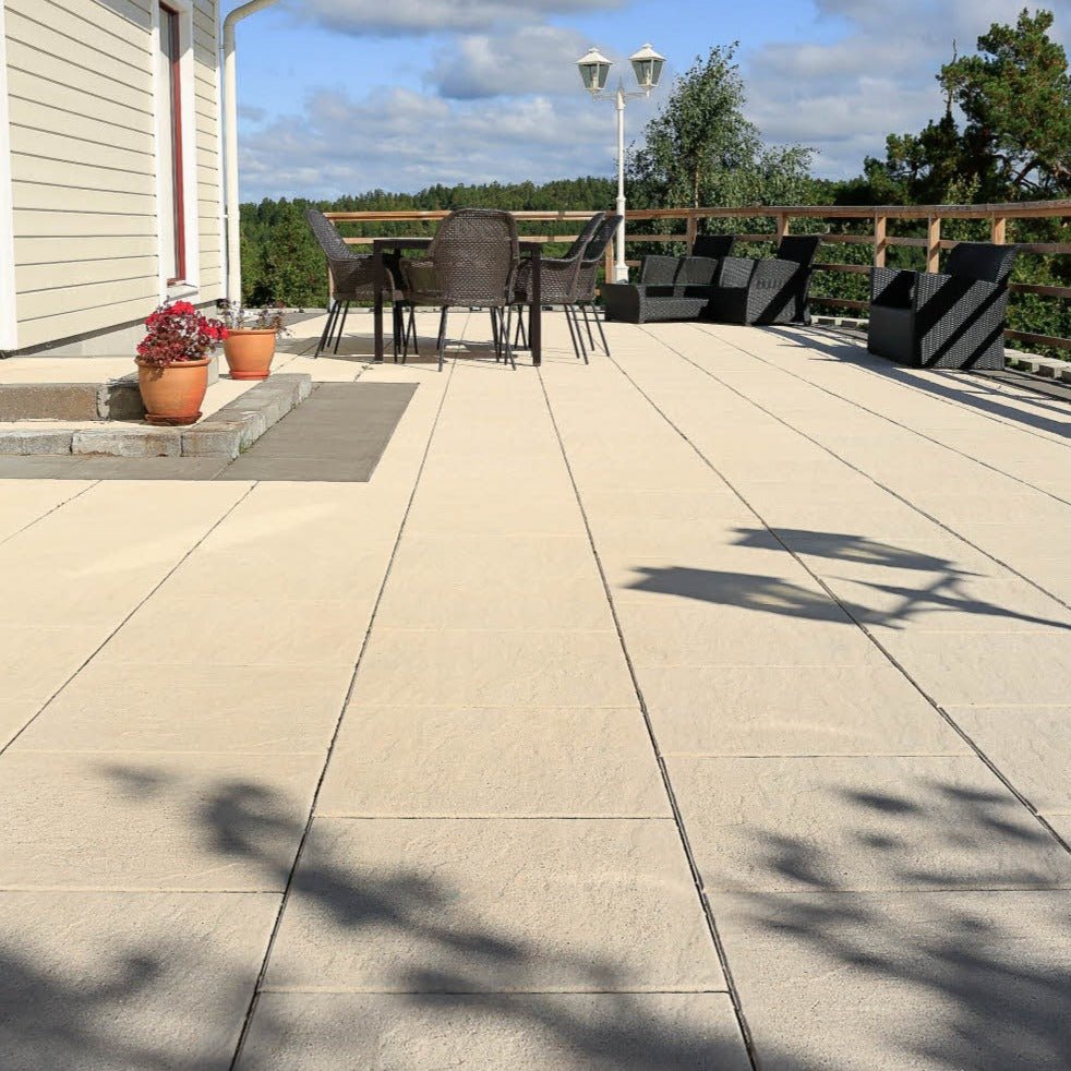 En trädgårdsplatta med en ytstruktur som påminner om sandsten eller skiffer. Den stora plattan blir ett fantastiskt vackert golv på uteplatsen eller som trädgårdsgång upp till husets entré. Plattan är inte körbar utan lämpar sig för gång- och vistelseytor utan trafik.