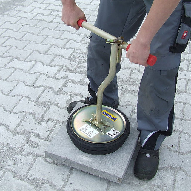 En smart vakuumlyft för montering av stenplattor. Lyften hjälper dig med både mellanstora och stora plattor och verktygets huvud pressas mot stenens yta och suger tag i plattan. Stenens yta behöver vara helt slät så att vakuum bildas och lyft kan ske utan att tappa stenen. Spar på ryggen och lyft med rätt lyftverktyg!