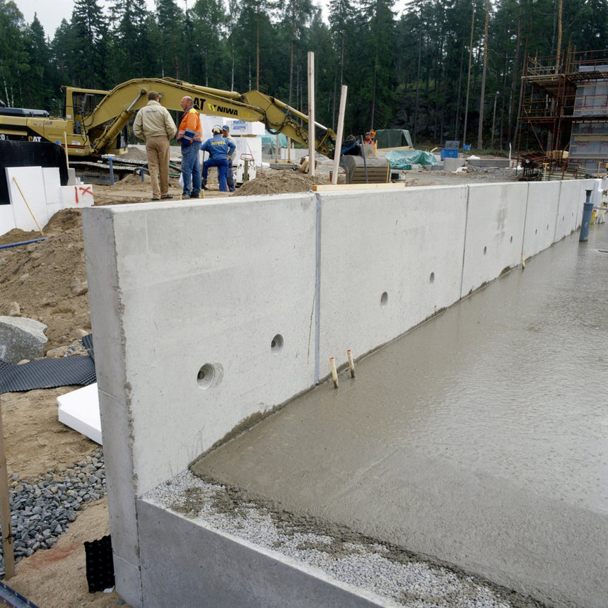 Här har vi en produkt som klarar trycket av tung trafik och en armering för belastning på upp till 20kN. Bredden på 1m gör denna produkt till en passbit som monteras i slutet av murmonteringen. Den rollade ytan gör det möjligt att beklä muren med vacker natursten om så önskas. Muren monteras tillsammans med övriga L-stöd från not-not serien.