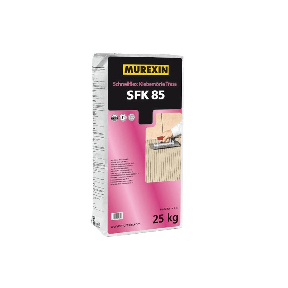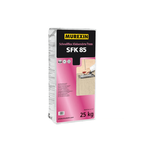 SFK85 är ett grått snabbfix för framförallt känsliga naturstensprodukter som kalksten, marmor och andra ytor som inom kort kommer att belastas. Detta är ett snabbhärdande fix vilket gör att du inte bör blanda för mycket åt gången. Om du inte arbetar med en känslig natursten kan Murexin KTF55 ofta vara enklare att jobba med. SFK85 Kan läggas mellan 4-20 mm tjockt. Då detta är ett snabbfix så har du endast en korrigeringstid på ca 5minuter.