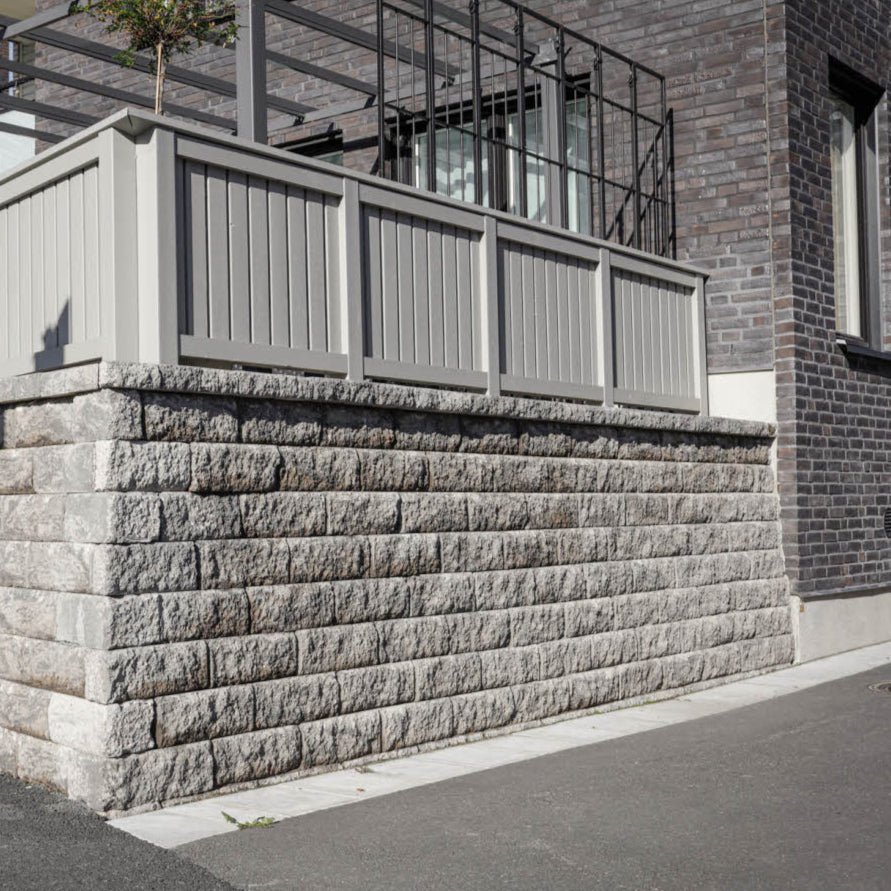 Denna lätta lutande mur med strukturerad framsida är perfekt för att bygga riktigt höga, stadiga murar utan att offra någonting på den estetiska fronten. Det kraftiga låssystemet låter dig bygga höga, pålitliga murar! I serien hittar du även radiestenar och dubbelsidiga stenar som kan kombineras efter din fantasi för att bygga terrasseringar, svängda trädgårdsmurar och varierande höjder.