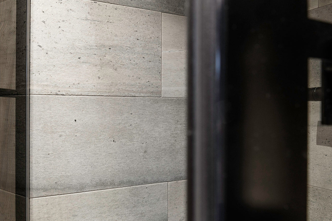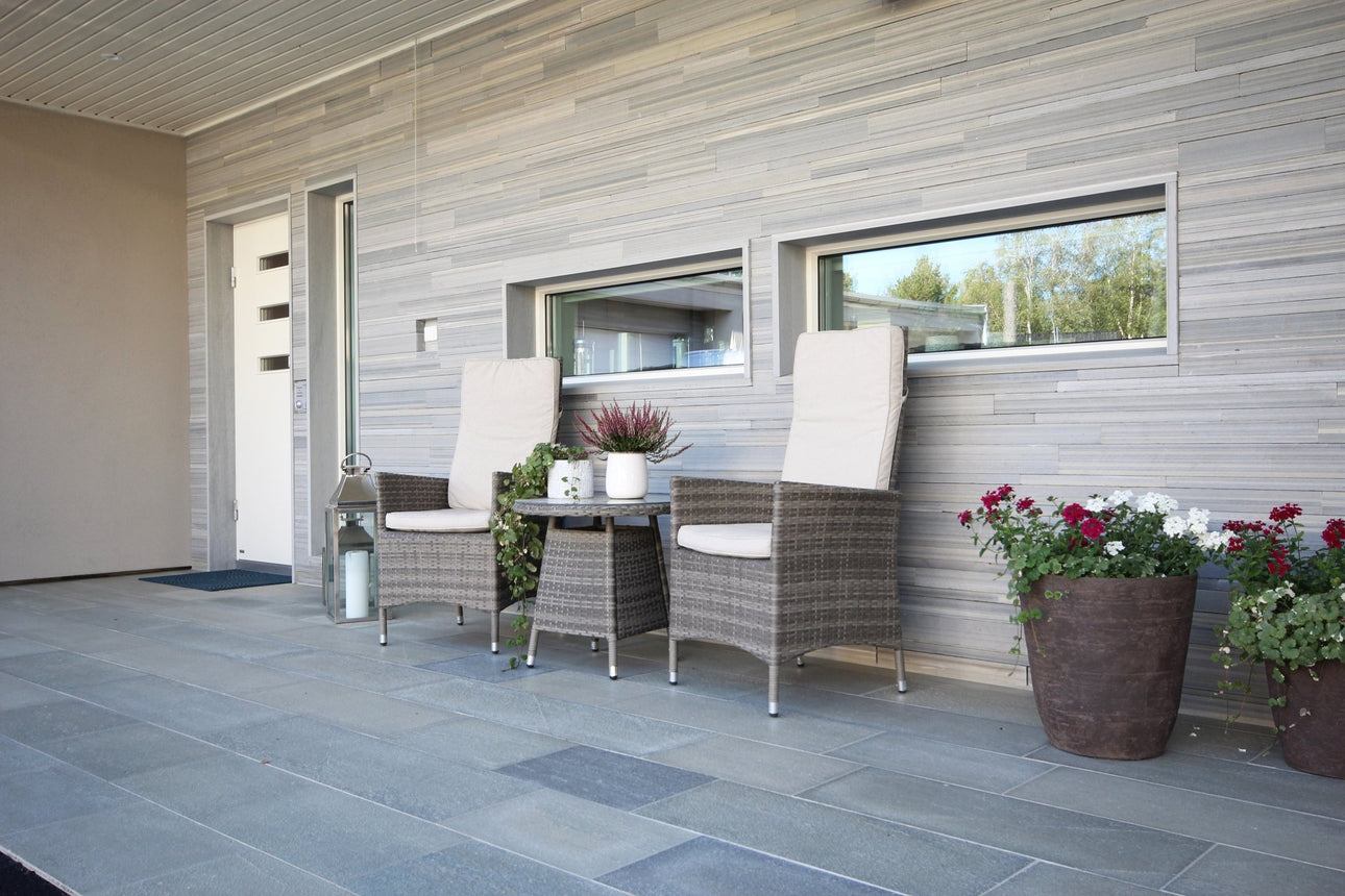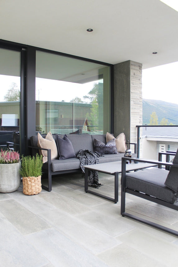 Oppdalsskiffer i sågade hällar. Plattorna kommer i fallande längder vilket gör att ytan får oregelbundet placerade fogar. Tjockleken varierar mellan 30-40 mm och får justeras i nivå med hjälp av underlaget. Finns även i bredderna 200mm, 400 mm, 500 mm samt 600 mm.