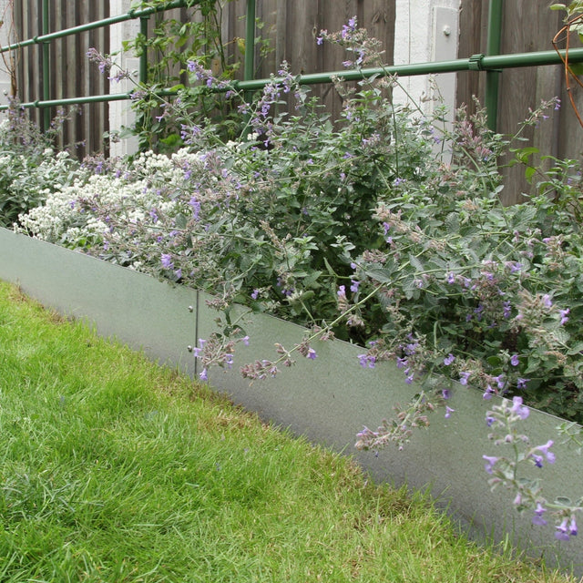 Rak planteringskant i aluzink, en beläggning som förhindrar stålet från att rosta. Beläggningen kan ljusna något under årens gång, men förebygger fortfarande rostangrepp. Stålkanten passar perfekt längs planteringar eller runt träd och skyddar utvalda ytor vid gräsklippning. Finns i längder från 180-1150mm.
