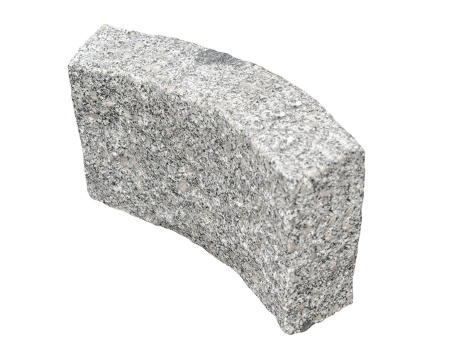 Granitkantsten i kraftigt radieformat och svängt format. Stenen passar med övriga stenar i serien och kombineras enkelt till böljande former och stabila kanter där den monteras. Stenen har en radie på 0.5m.