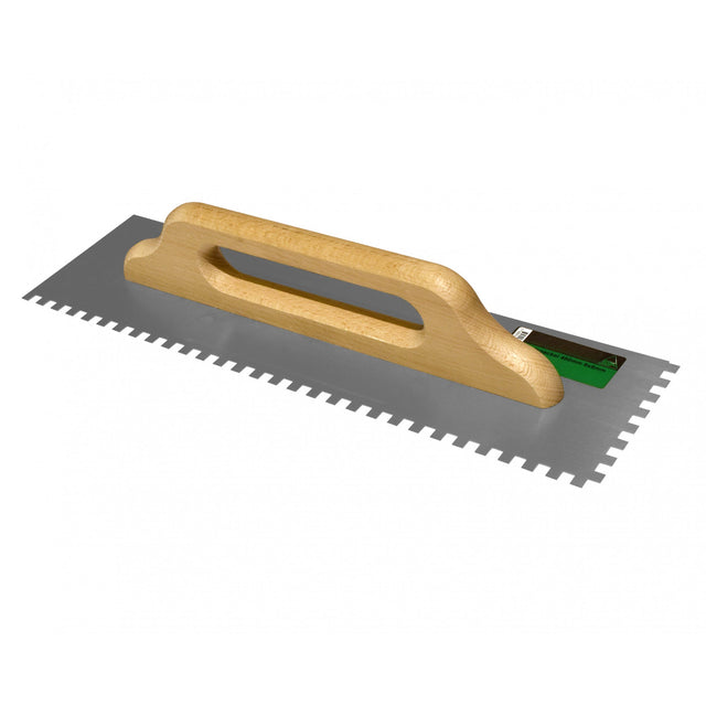 Tandspackel med tänder på både lång- och kortsida. Denna tandspackel har ett praktiskt trähandtag och används för att garantera ett jämnt skikt fästmassa.